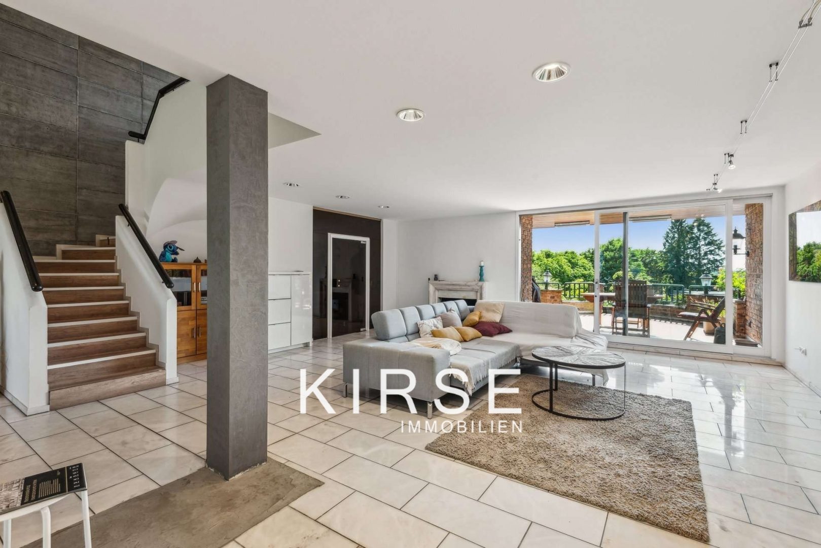 Schon beim Betreten öffnet sich ein lichtdurchfluteter Wohnbereich, dessen Boden mit edlem Marmor ausgelegt ist – ein Ausdruck moderner Grandezza und luxuriöser Materialität. Der offene Kamin sorgt für wohnliche Wärme und markiert das Herzstück dieses großzügigen Raumes. Hier erleben Sie ein Wohngefühl, das gleichermaßen exklusiv wie einladend ist.