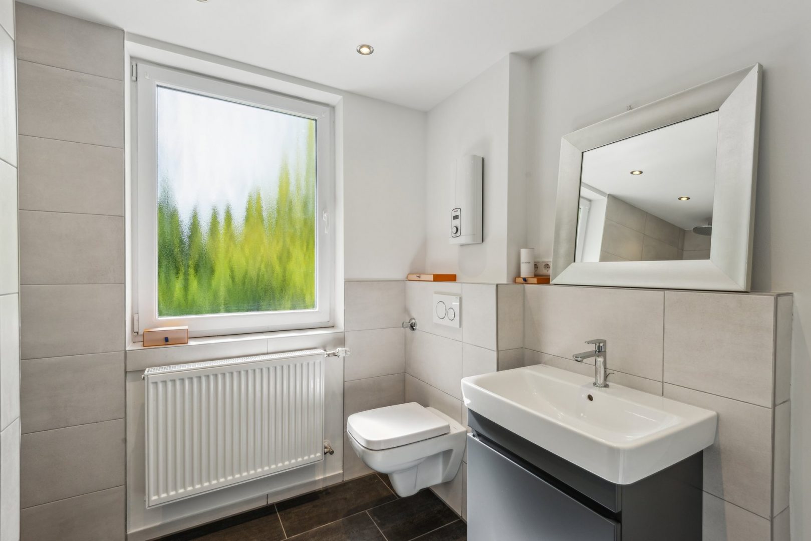 Das Badezimmer wurde komplett neu gestaltet und vergrößert – mit bodengleicher Dusche, Badewanne und hochwertigen Armaturen. Auch der Balkon wurde saniert, während die moderne Fassadenbeleuchtung mit Up- & Down-Spots sowie Bewegungsmeldern im Außenbereich und eine Kamera-Gegensprechanlage im Eingangsbereich für Atmosphäre und Sicherheit sorgen.