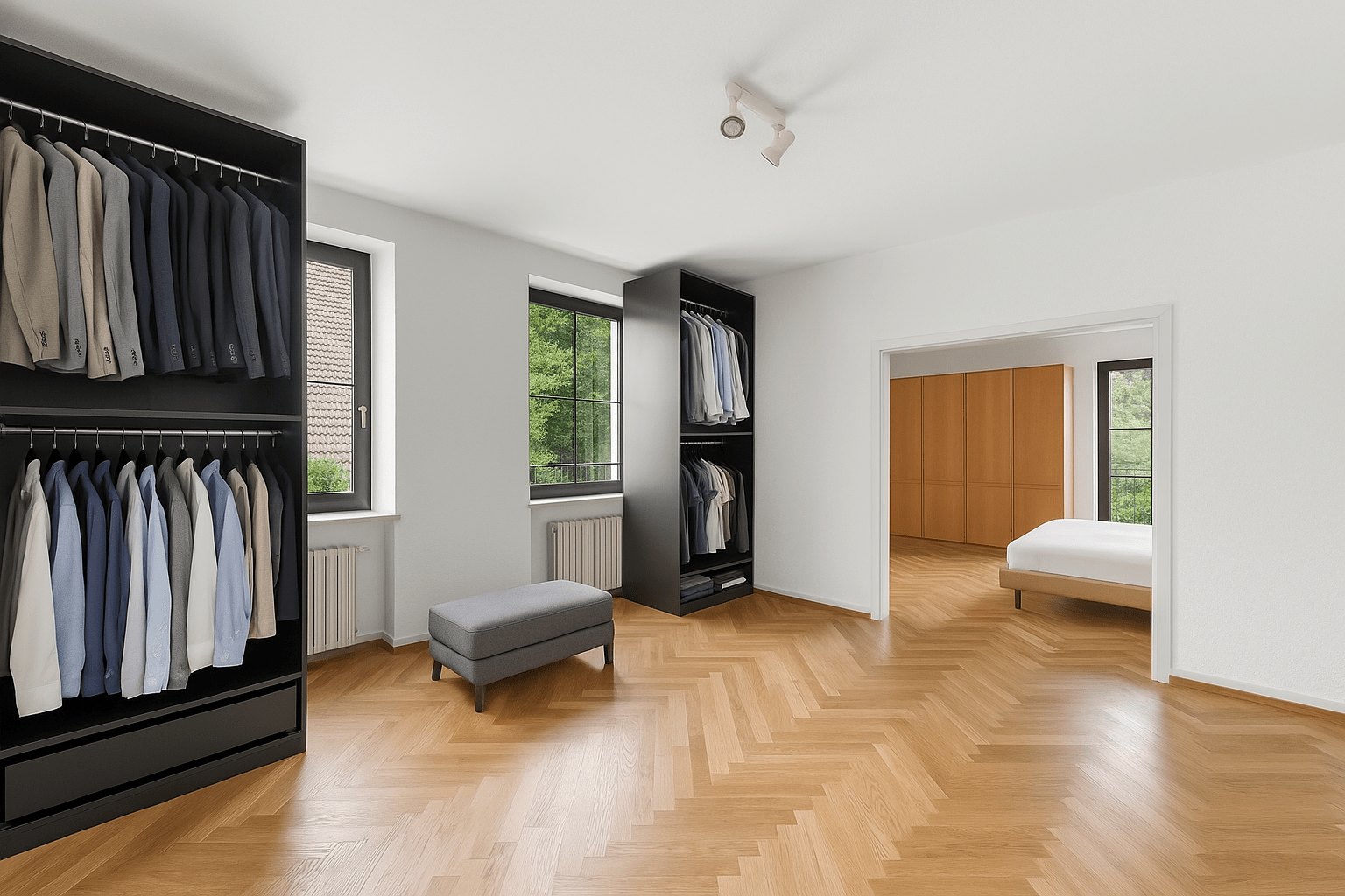 Über das elegante Treppenhaus erreichen Sie das Obergeschoss, das vier vielseitig nutzbare Räume bereithält. Das Masterschlafzimmer überzeugt mit einem angrenzenden Raum, der ideal als begehbarer Kleiderschrank oder Büro genutzt werden kann. Zwei weitere Zimmer bieten sich als Kinderzimmer oder Gästezimmer an. Ein modernisiertes Badezimmer mit XL-Badewanne, bodengleicher Dusche und hochwertigen Armaturen sorgt für Wellnessmomente im Alltag. Zusätzlich steht auf dieser Etage ein Hauswirtschaftsraum zur Verfügung, der für Ordnung und Funktionalität sorgt.