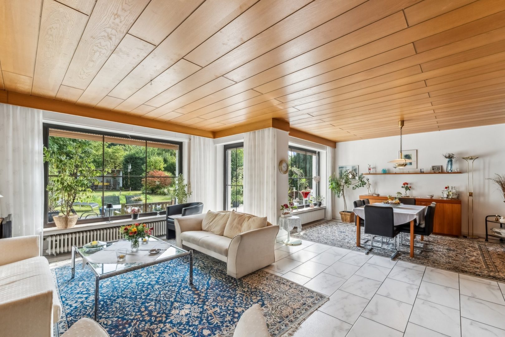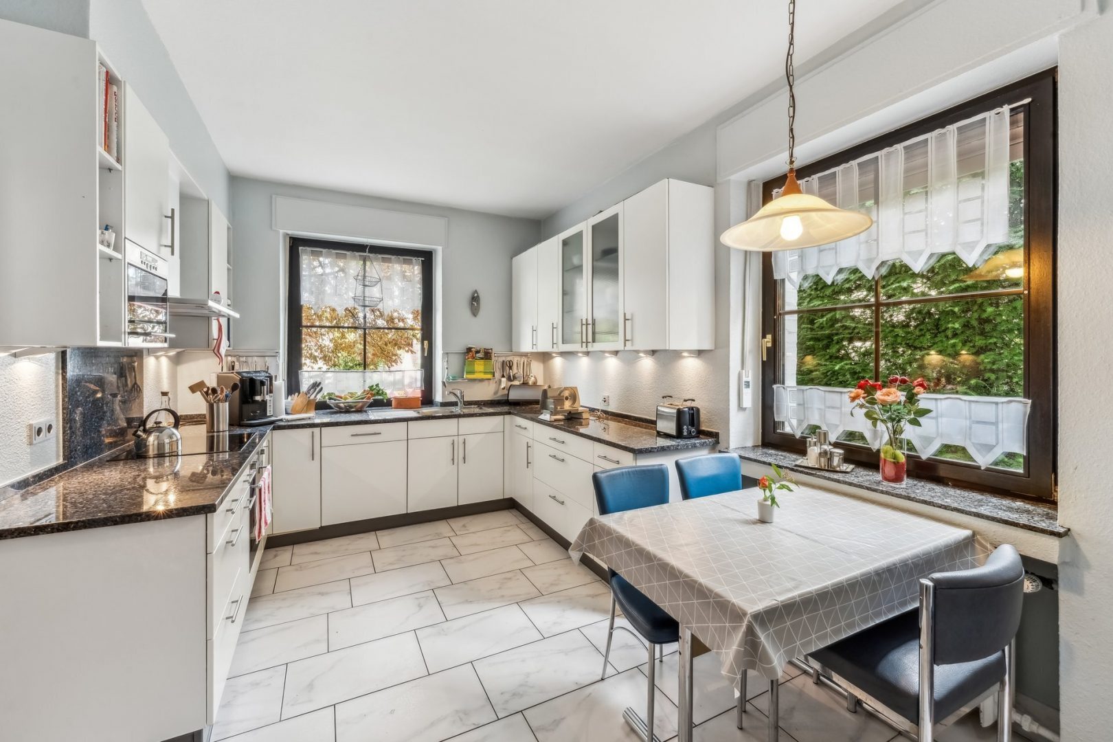 Im Erdgeschoss empfängt Sie ein lichtdurchfluteter Wohn- und Essbereich mit großen Fensterfronten, die den Blick in den traumhaften Garten öffnen. Der Raum lädt sowohl zum repräsentativen Empfang von Gästen als auch zu gemütlichen Familienabenden ein. Die großzügige Küche ist modern ausgestattet und bietet neben viel Arbeitsfläche auch Platz für einen Frühstückstisch. Ein praktisches Gäste-WC, in 2011 erneuert, komplettiert das Erdgeschoss.